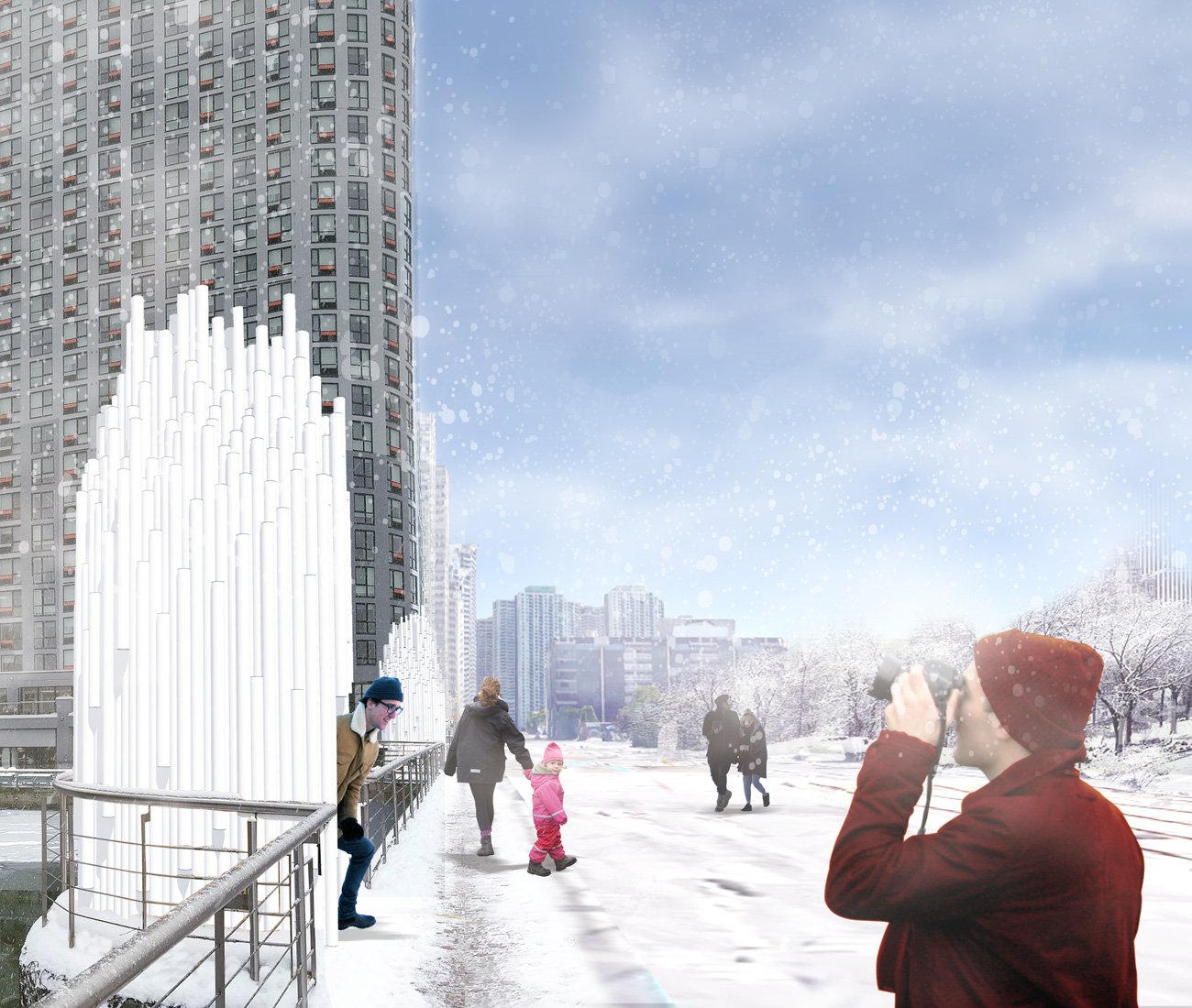 Steps from Connector, local designers Rob Shostak and Dionisios Vriniotis (who participated in Winter Stations in 2017) will erect two light-refracting sculptures that, from the water, could double as lighthouses. As visitors enter a chamber carved in these 15-foot sculptures, light from the sun refracts and creates a colourful spectrum. “The cascade of colours spreads throughout the space and onto the stargazers,” say its designers, mimicking how astronomers use light to learn about the composition of faraway stars.