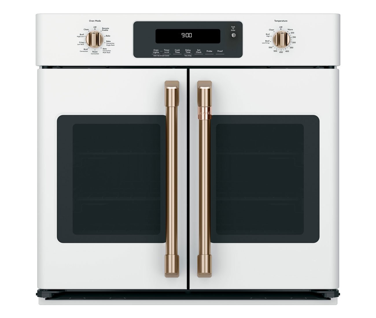 The Café appliance range comes in matte black and white finishes, soon to be followed by a stainless steel edition. It includes all the appliances you need to build a harmonious kitchen – from microwaves to wall ovens with French doors (shown below).