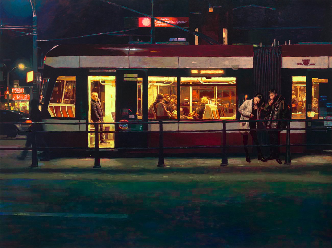 Working from photographs ensures that his subjects, and the locations they find themselves in, are given equal weight. In Arrival, for instance, a glowing TTC streetcar spills light onto the street, where two of the artist’s friends wait behind a barrier. Through the open door and windows, the faces of passengers and vacant red-upholstered seats are illuminated.