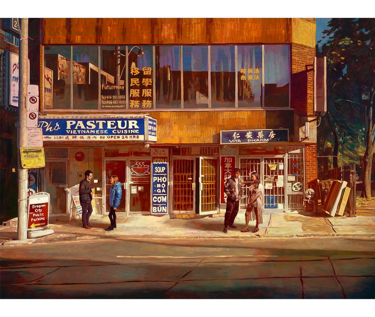 Meeting Place shows a ramshackle strip in Chinatown in stunning detail. Chinese characters and road signs jostle for attention with a Vietnamese phở joint, while a parking sign directs unseen cars to Dragon City, a glass-clad shopping mall with a cult following of bargain hunters, located at the corner of Dundas and Spadina.