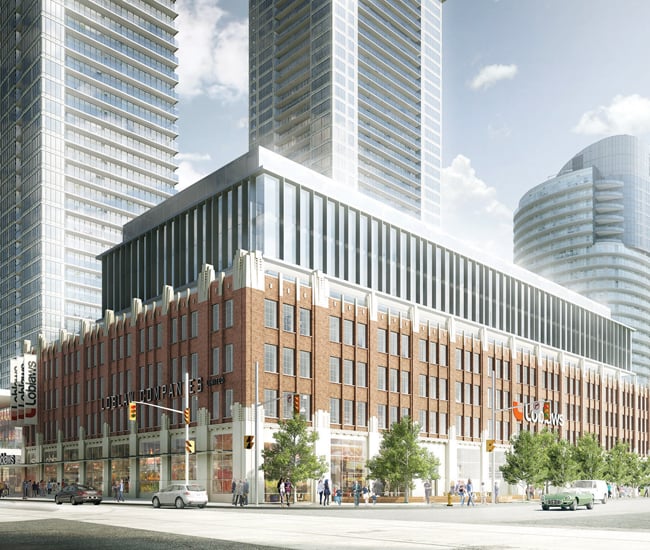 Once a Loblaws warehouse, the abandoned 1928 art deco building at Bathurst and Lake Shore is set to become the company’s latest flagship. Having a grocer on site, stocked with trendy superfoods, is sure to appeal to residents of the Page + Steele condos rising nearby. Under the guidance of ERA Architects, the landmark’s crumbling walls will be disassembled brick by brick and rebuilt around a new shell, while a glass addition by architectsAlliance adds office space up top.