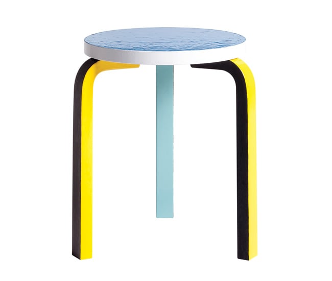 A lustrous black tones down the asymmetrical strips of radiant yellow and blue on Stool 60’s three legs. Alvar Aalto’s iconic seat celebrates 80 years with a jazzed-up transformation by German artist Mike Meiré. artek.fi