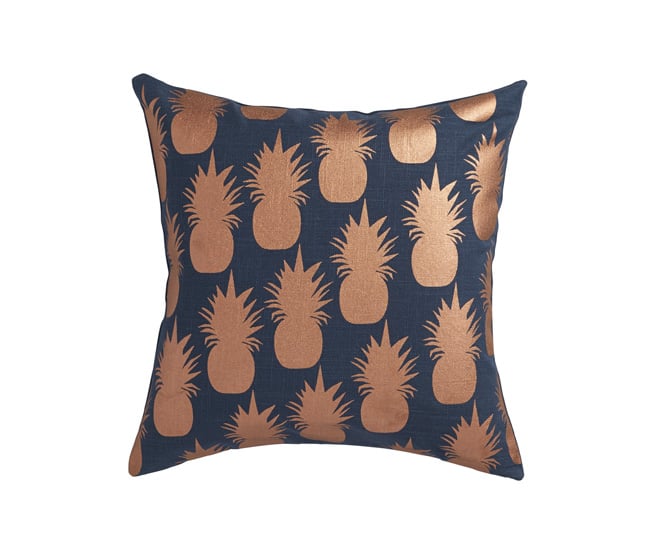 Pineapples are a symbol of hospitality, making Aelfie Oudghiri‘s patterned pillow design perfect for your guest bedroom. A copper foil tropical fruit motif pops against the navy cotton cushion cover. Available in both feather-down and down-alternative versions. cb2.com