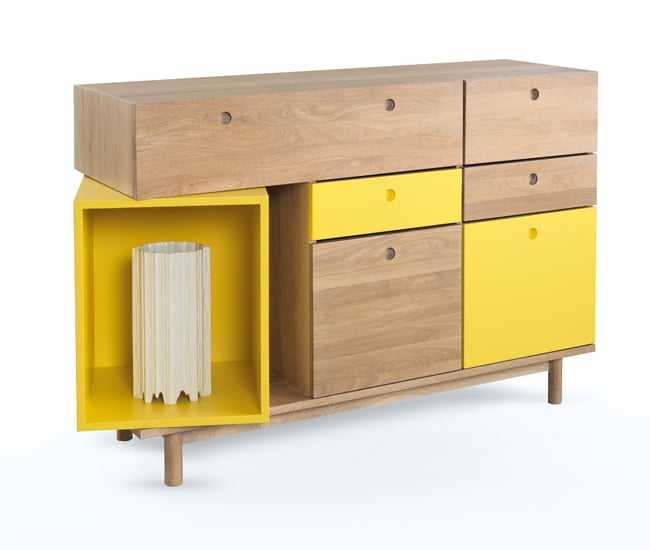 Vibrant yellow accents enliven Portuguese manufacturer Wewood’s oak sideboard. Twist the side compartment to draw attention to a fun heirloom. wewood.eu