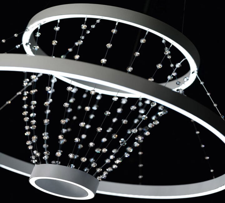 Strandelier is a minimalist LED chandelier by Todd Bracher employs chains of Swarovski crystals to connect the concentric metal rings. swarovski.com