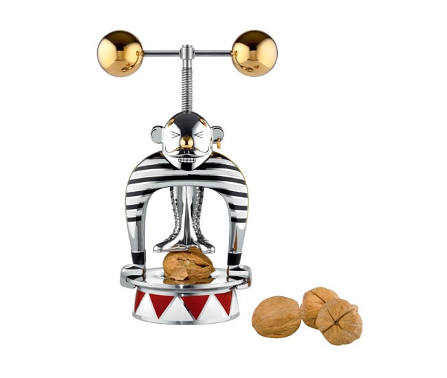 Thankfully, it doesn’t take the strength of a weightlifter to twist the golden barbell atop this stainless-steel nutcracker. Only 999 are being made as part of Alessi’s Circus collection designed by Marcel Wanders. alessi.com