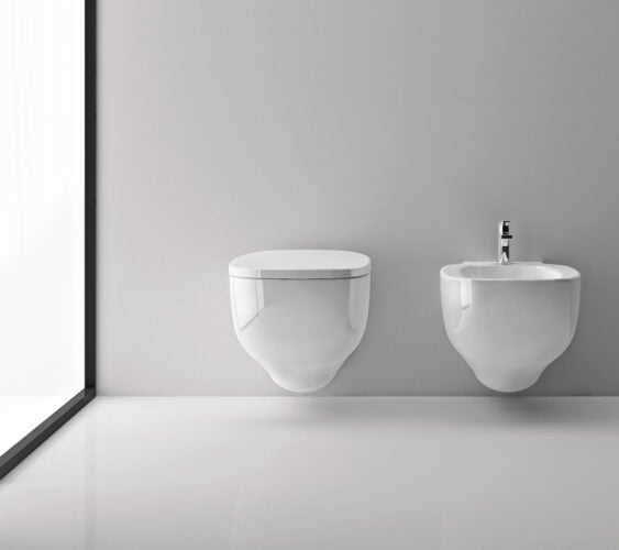 Piero Lissoni’s suspended toilet and bidet are composed of enamelled ceramic with a rounded rectangular cover in resin. boffi.com