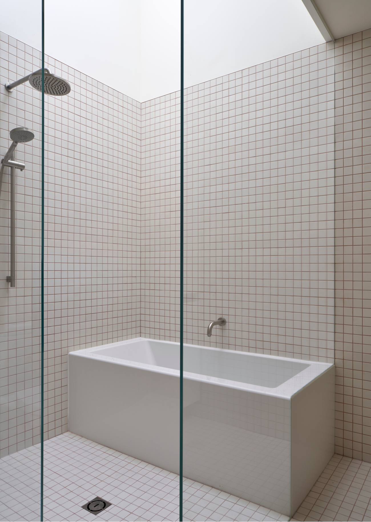 The ensuite, too, basks in the glow from the clerestory. Mosaic tile from Daltile; tub and fittings from Taps.