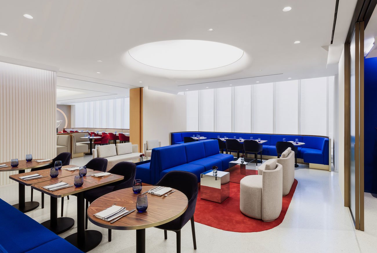 In the main dining room, a palette of natural tones – including stone tabletops, wood banquettes and a terrazzo floor – is punctuated by luxuriously textured red chairs. Around the corner, a smaller dining nook swaps out red for blue, the soft seating paired with a glossy counter in the same tone. The dining room’s trio of primary colours is also subtly rounded out by a frame of mustard-yellow booth seating.