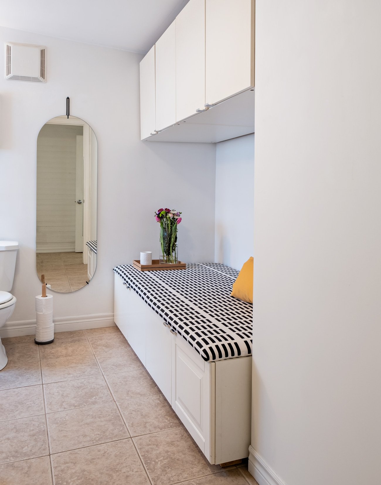 In the bathroom, an unused tub rough-in was converted into a daybed by the previous owner, and later reupholstered by Moreiro. Even in this roomy space, they still look for ways to reduce the number of objects they own. “Both of us are really in that mindset,” says Chris Hanz. Currently, they are experimenting with using bathrobes instead of towels, taking their minimalist lifestyles as far they comfortably can.
