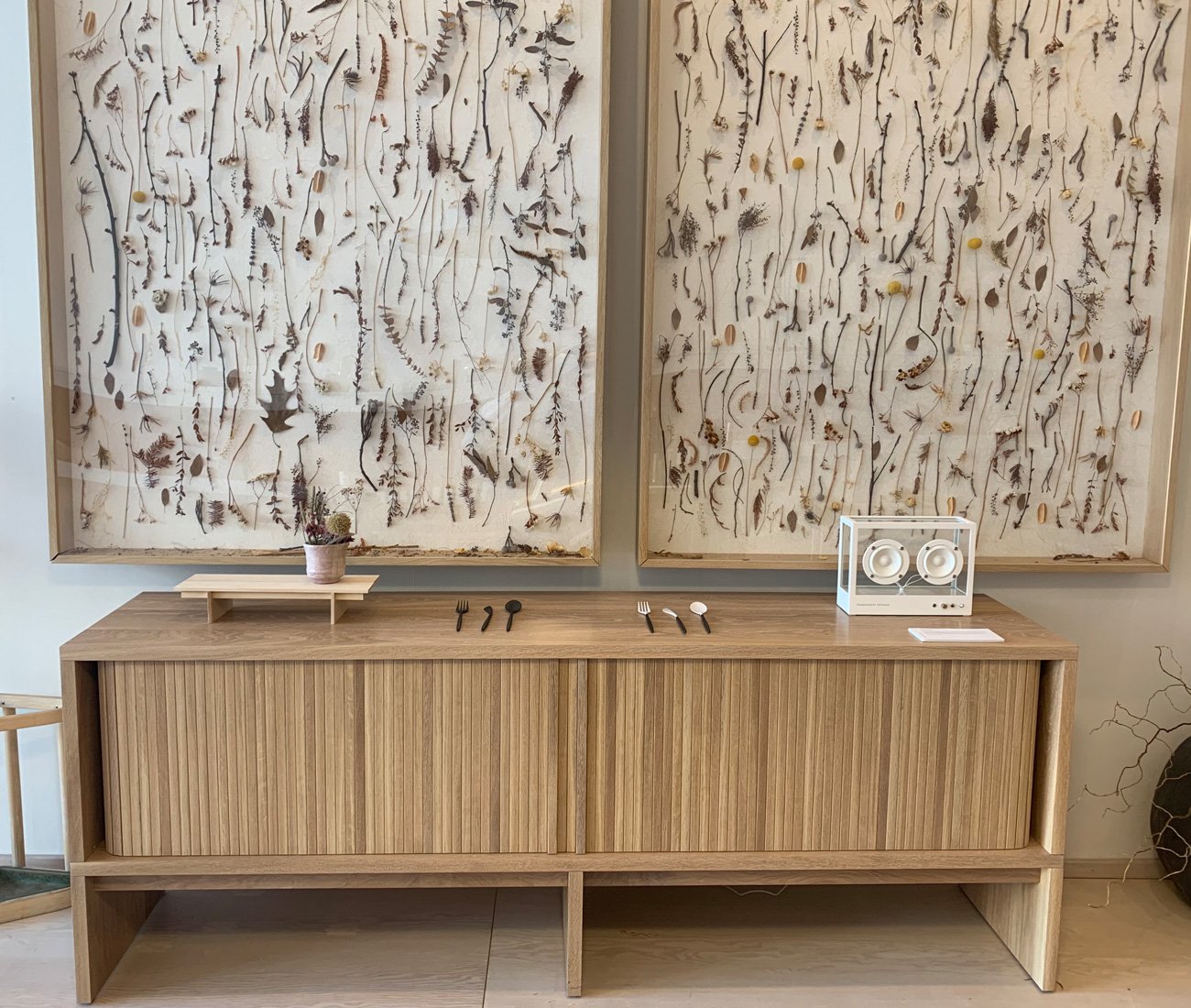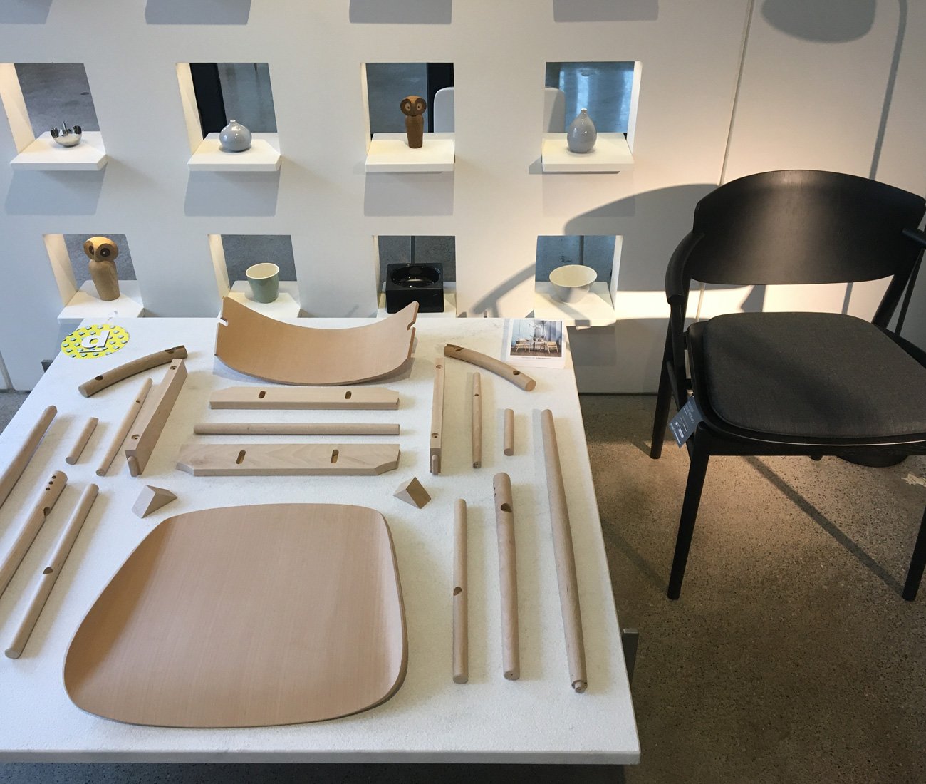 Designlines loves Danish design just as much as it does process and transparency. And as much as we enjoyed perusing the classics of Erik Jorgensen, Carl Hansen & Søn, PP Mobler and Georg Jensen, it was the recent releases by Fritz Hansen that caught our eye. With the aim to return to the all-wood design, the company called upon Japan’s Nendo to design this No1 chair (to the right) and we really appreciated seeing it deconstructed. This playful flat-lay of symmetry and shapes makes for the perfect ‘knolling’ photo opportunity and the attention to angles and spacing is certainly note-worthy. This show was spread across two storeys and two showrooms: Hollace Cluny and Torp.